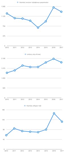 Σε άλλα θέματα τα στοιχεία λένε άλλες ιστορίες, ανάλογα πώς τα διαβάζει κανείς. Οι ληστείες στα σπίτια είναι όντως λιγότερες από ό,τι ήταν το 2012 -αλλά ακόμα πολύ περισσότερες από ό,τι ήταν το 2010, ας πούμε. Οι κλοπές και οι διαρρήξεις είναι λιγότερες από ότι το 2010 ή το 2011, αλλά αυξάνονται σταθερά από το 2014 και μετά. Το ίδιο και οι κλοπές τροχοφόρων. Από την άλλη, οι ανθρωποκτονίες μειώνονταν σταθερά και θεαματικά από το 2011 μέχρι το 2015, οπότε και σταθεροποιήθηκαν λίγο πολύ.