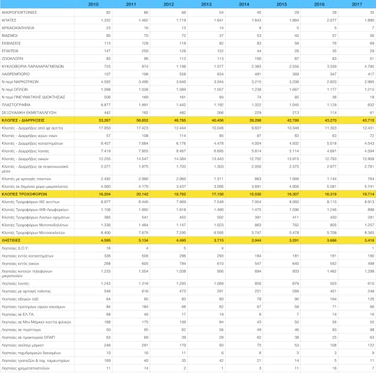 Η Ελληνική Αστυνομία έχει μια σελίδα στο ίντερνετ μέσα από την οποία διαθέτει στο κοινό στατιστικά στοιχεία. Διάφορα στατιστικά στοιχεία. Μεταξύ άλλων, έχει και αναλυτικούς πίνακες για τα εγκλήματα που γίνονται στη χώρα, όπως τα καταγράφουν οι αρμόδιες υπηρεσίες της. Έχει επίσης και εκθέσεις της Eurostat. Γενικά, πολύ υλικό. Αν έχετε απορίες για την εγκληματικότητα στην Ελλάδα, μπορείτε να ανατρέξετε σε αυτά τα στοιχεία. Αν, ας πούμε, θέλετε να δείτε πόσες ληστείες γίνονταν στην Αττική τα τελευταία χρόνια, μπορείτε να αναζητήσετε τα συγκεκριμένα στοιχεία στους αντίστοιχους πίνακες. Υπάρχουν. Η αξιοπιστία αυτών των αριθμών δεν μου είναι γνωστή, αλλά αυτά είναι τα μόνα επίσημα νούμερα που είναι διαθέσιμα. Υποθέτω ότι αν δεν σας αρέσουν, μπορείτε να την αμφισβητήσετε. Ό,τι θέλετε μπορείτε να κάνετε. Επίσης, αν βαριέστε να κατεβάζετε τα μεμονωμένα εξελόφυλλα, μπορείτε να κατεβάσετε αυτό εδώ, όπου έχω συγκεντρώσει πολύ βιαστικά τα στοιχεία για την Αττική. Ελπίζω να μην έχει γίνει λάθος στο copy/paste. Αν έχει γίνει, είναι εύκολο να το βρει κανείς -έτσι είναι όταν υπάρχουν διαθέσιμα ανοιχτά δεδομένα.