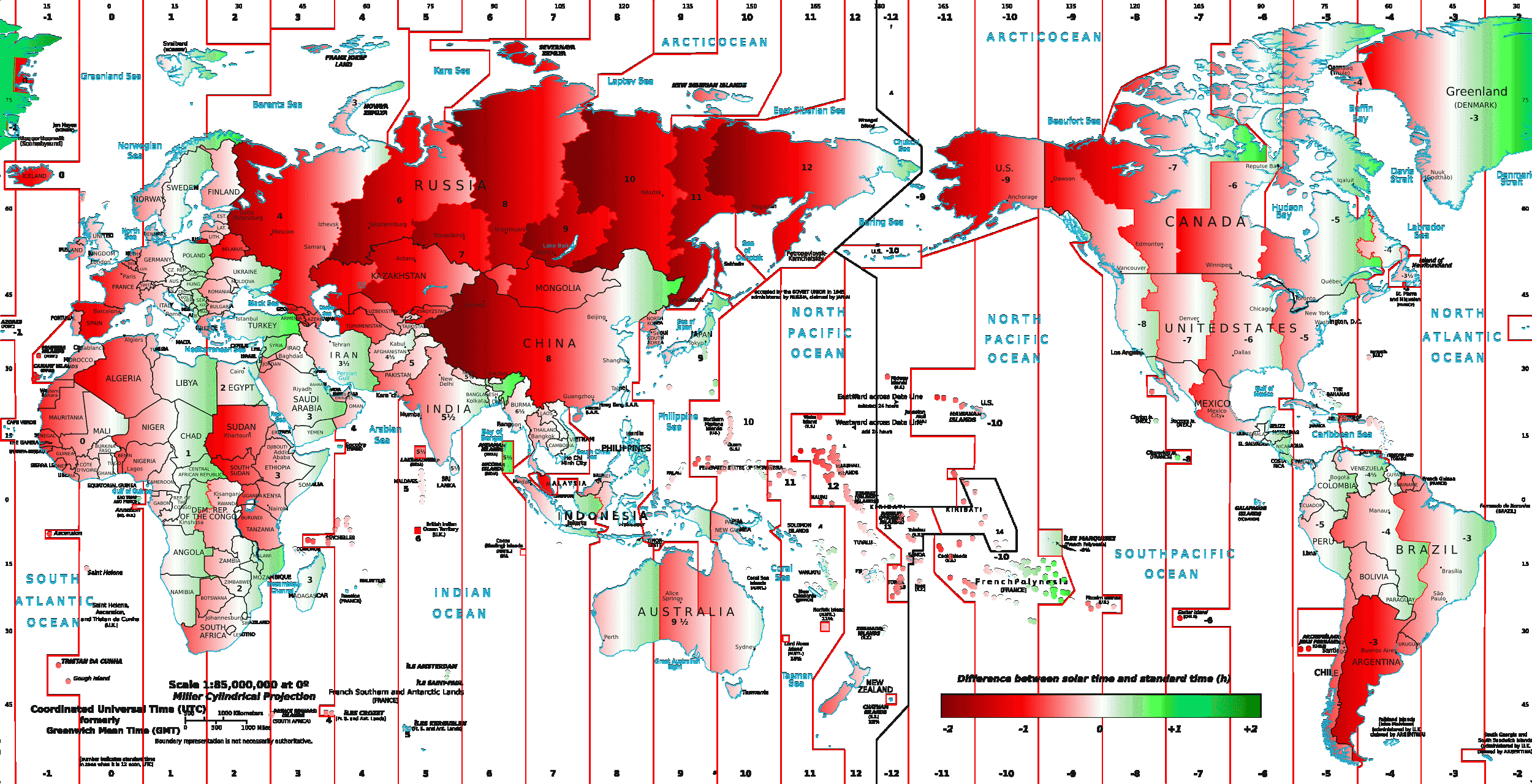 Σε ετούτο εδώ το χάρτη βλέπουμε τις χρονοζώνες στις οποίες είναι χωρισμένος ο κόσμος. Ο μηχανικός της Google Στέφανο Ματζιόλο τον έφτιαξε, και τον χρωμάτισε έτσι ώστε να φαίνεται πόσο μπροστά ή πίσω από την "πραγματική" ώρα είναι κάθε περιοχή του πλανήτη. Η "πραγματική" ορίζεται αυτή κατά την οποία ο ήλιος βρίσκεται στο υψηλότερο σημείο του στον ουρανό στις 12 το μεσημέρι ακριβώς. Ε, όπως βλέπεις, σε ελάχιστες περιοχές του πλανήτη ισχύει αυτό. Στη δυτική Κίνα (η οποία έχει ολόκληρη την ίδια ώρα) ο ήλιος φτάνει στο ψηλότερο σημείο κι έχει ήδη πάει 3μμ, ας πούμε. Το Λονδίνο, η Στοκχόλμη, η Βιέννη είναι αρκετά κοντά στην "σωστή" ώρα, αλλά εμείς είμαστε λίγο λάθος -λίγο πιο "αργά" από ό,τι υπαγορεύει η πορεία του ήλιου στον ουρανό.