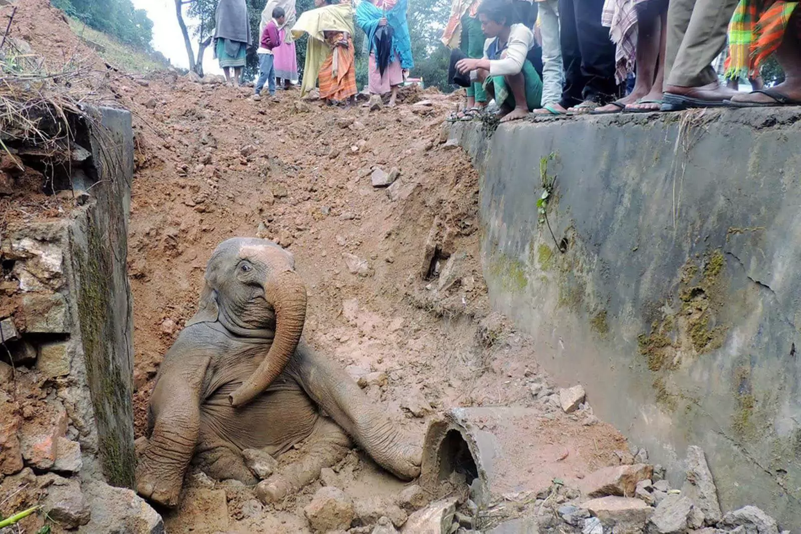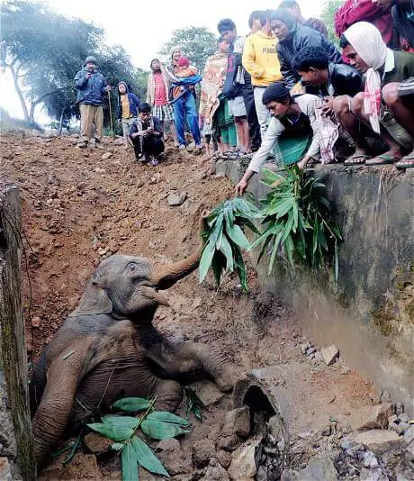 Ετούτο το ελεφαντάκι έπεσε σε ένα χαντάκι δίπλα σε σιδηροδρομικές ράγες, κάπου στη βορειοανατολική Ινδία. Σύμφωνα με αυτό το ρεπορτάζ, άνθρωποι κατέβηκαν από το τρένο και το βοήθησαν να βγει απ' το χαντάκι.