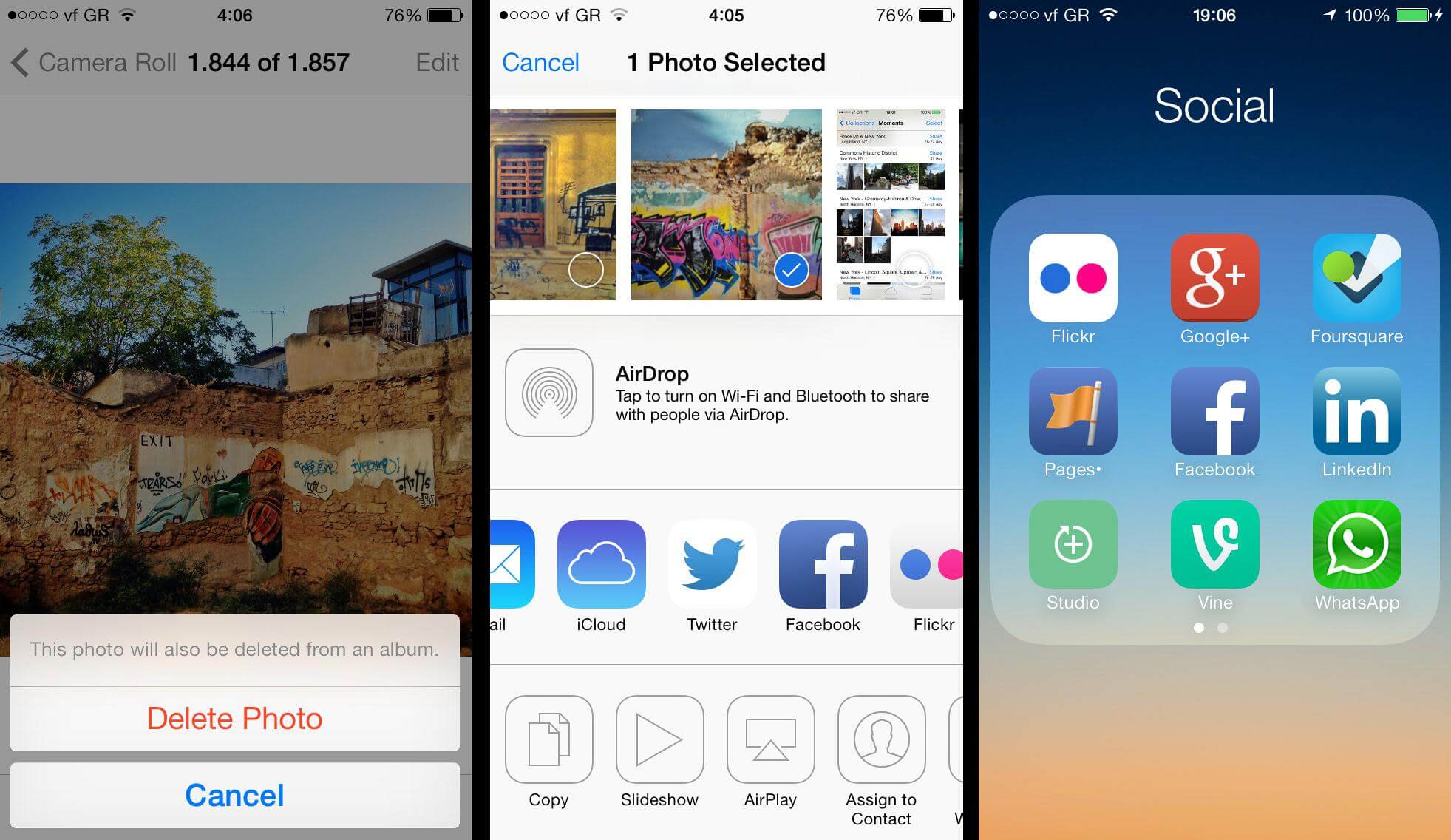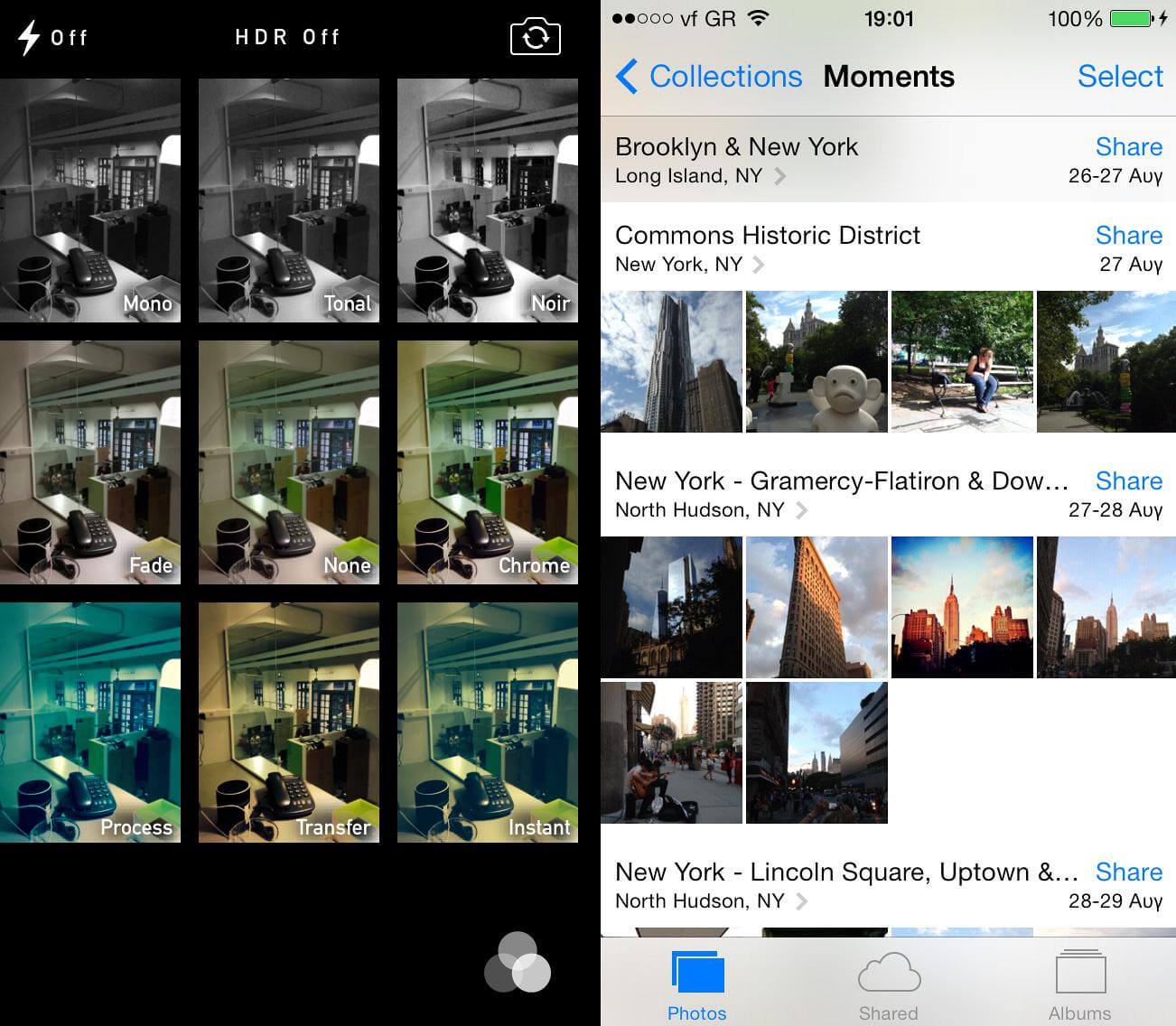 Η σημαντικότερη αναβάθμιση που έχω δει είναι στο "camera" app, το οποίο πλέον είναι πιο καθαρό και γρήγορο, και μοιάζει πολύ με τα αντίστοιχα των κορυφαίων Android. Οι φωτογραφίες τραβιούνται ακαριαία, μπορείς να τις τραβήξεις και απευθείας τετράγωνες (για το Instagram), ή να τους κάνεις ένα υποτυπώδες editing (και με φίλτρα) επί τόπου, είναι πάρα πολύ καλύτερο από του iOS 6. Ανυπομονώ να το δοκιμάσω στο 5S, με τα καινούρια modes.
