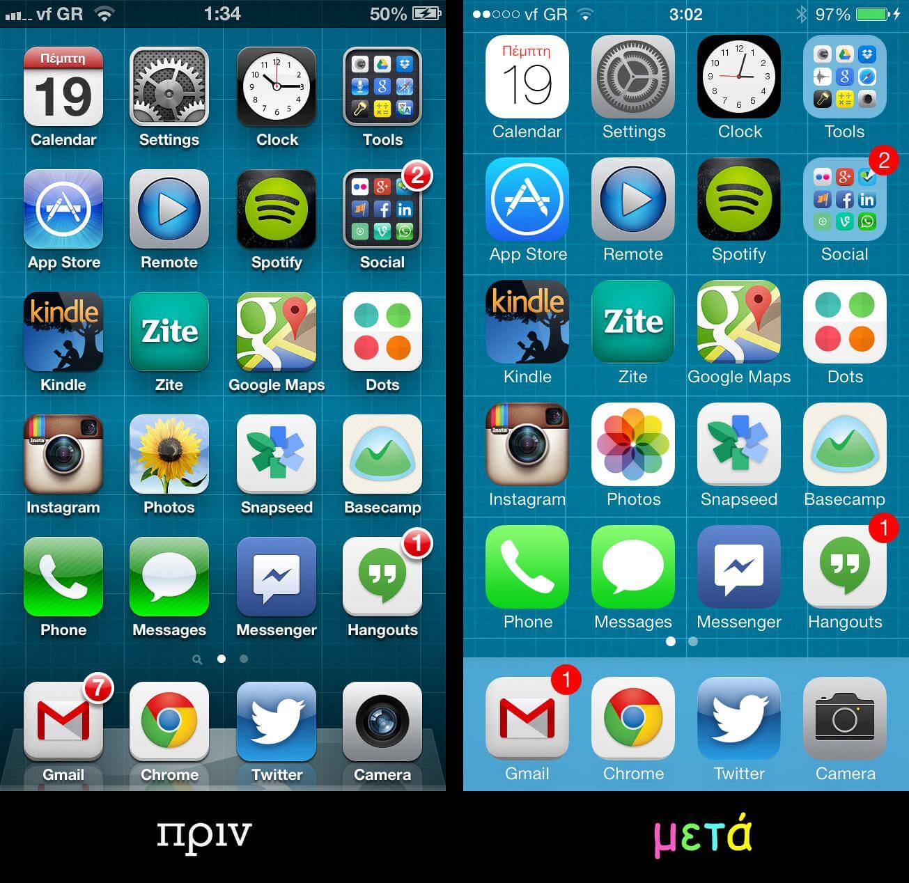 Όταν πρωτοανακοινώθηκε η κυκλοφορία του iOS 7 λίγους μήνες πριν και είδαμε για πρώτη φορά σε παρουσιάσεις και οθόνες πώς θα μοιάζει η φάτσα του, μια αναγούλα απλώθηκε στις τάξεις κάποιων εκ των Appleτων και των iPhonιάδων. Το πράγμα αυτό ήταν κακάσχημο, μια οπτική βαβούρα από χρώματα και σχήματα που παρέπεμπταν σε νηπιαγωγείο. Τώρα που είχα την ευκαιρία να το δω στην πράξη έχω να πω ότι δεν είναι και τόσο χάλια. Πολλές από τις επιλογές που έχουν γίνει είναι πολύ αλλόκοτες (δες το #2) αλλά το συνολικό αποτέλεσμα δεν είναι κακό και, με το που το βλέπεις, καταλαβαίνεις ότι θα το συνηθίσεις σύντομα και δεν θα σου λείπει η παλιά του φάτσα καθόλου. Μερικά στοιχεία, δε, όπως τα πιο απλοϊκά navigation εικονίδια στο κάτω μέρος των apps και η γραμματοσειρά στα περισσότερα σημεία (Helvetica Neue, χιψτεροφοντ, αλλά τέλος πάντων) είναι πιο ωραία και καθαρά. Πολλοί έχουν γράψει ότι το navigation στο λειτουργικό και μέσα στα ξεχωριστά apps είναι πιο μπερδεμένο τώρα και για τους "απλούς" χρήστες των iPhones θα είναι δύσκολο, τα κουμπιά λιγότερο προφανή, αλλά δεν ξέρω πόσο μεγάλο πρόβλημα θα αποδειχτεί αυτό. Νομίζω όχι μεγάλο.
