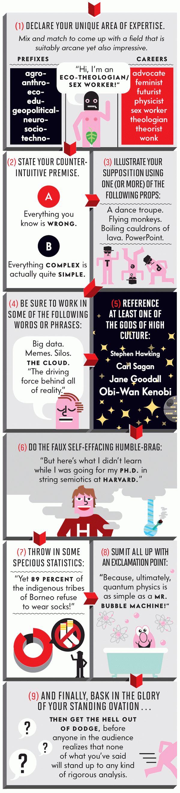 Με αφορμή το TED 2013 που έγινε πριν από λίγες ημέρες στο Λονγκ Μπιτς της Καλιφόρνιας, το Vanity Fair έφτιαξε μια χιουμοριστική καταγραφή των στοιχείων που (υποτίθεται ότι) αποτελούν ένα τυπικό TED talk. Πλάκα έχει.