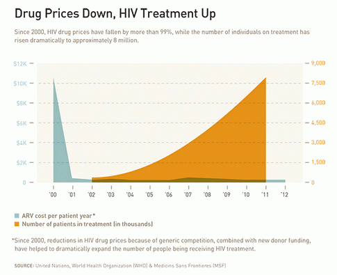 Να η δραματική μείωση του κόστους θεραπείας φορέων του HIV από το 2000 και μετά, και η συνακόλουθεί ραγδαία αύξηση των ανθρώπων που δέχονται θεραπεία.