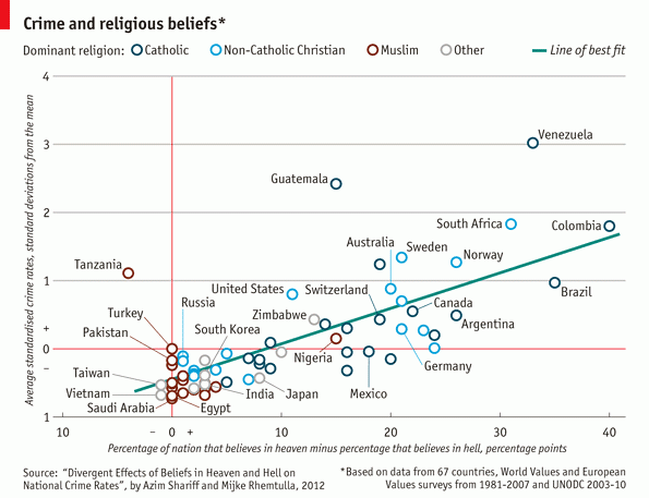Ετούτος εδώ ο πίνακας δείχνει το δείκτη της εγκληματικότητας σε μια κοινωνία ανάλογα με (δώσε βάση τώρα) την ποσοστιαία διαφορά αυτών που πιστεύουν στον παράδεισο από αυτούς που πιστεύουν στην κόλαση. Μπορεί να μοιάζει για παλαβή αναλογία, σα να προσπαθείς να βγάλεις συμπεράσματα από το χρώμα των μαλλιών των εγκληματιών ας πούμε, αλλά τέλος πάντων η γραμμή βγαίνει και το συμπέρασμα είναι το εξής: Οι κοινωνίες οι πολίτες των οποίων πιστεύουν αναλογικά περισσότερο στον παράδεισο και λιγότερο στην κόλαση (και άρα, όπως συμπεραίνουν οι επιστήμονες, φοβούνται λιγότερο την τιμωρία) εμφανίζουν μεγαλύτερη εγκληματικότητα.