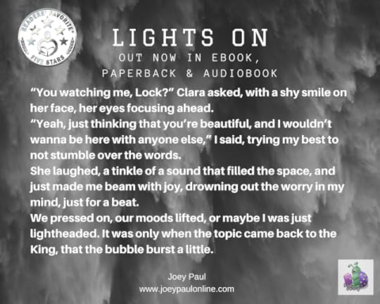 [ID: A smokey background with the title LIGHTS ON at the top and out now in ebook, paperback & audiobook just below the title The except reads: