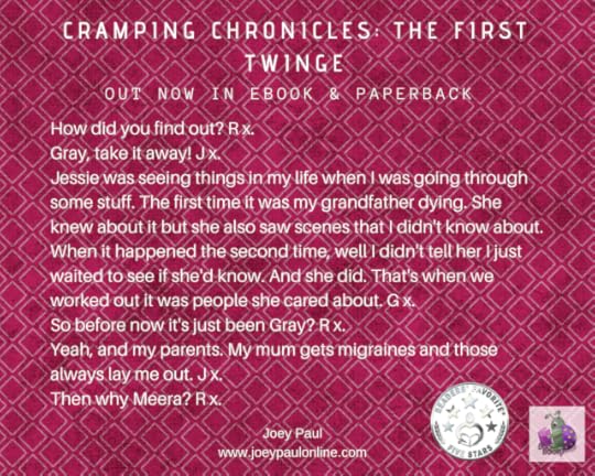 [ID: A red checked background with the title CRAMPING CHRONICLES: THE FIRST TWINGE at the top and out now in ebook & paperback just below the title The except reads: