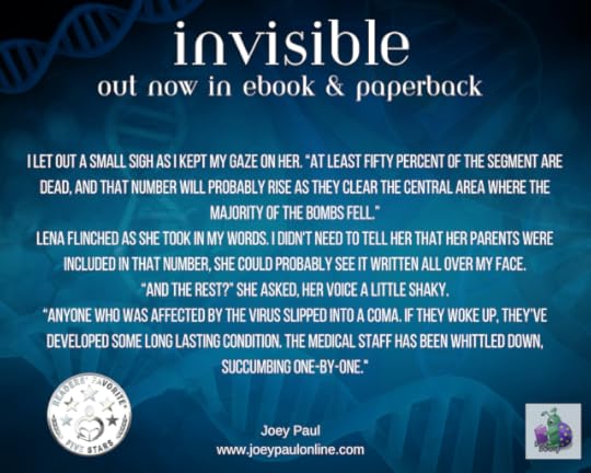 [ID: A blue DNA background with the title INVISIBLE at the top and out now in ebook & paperback just below the title The except reads: