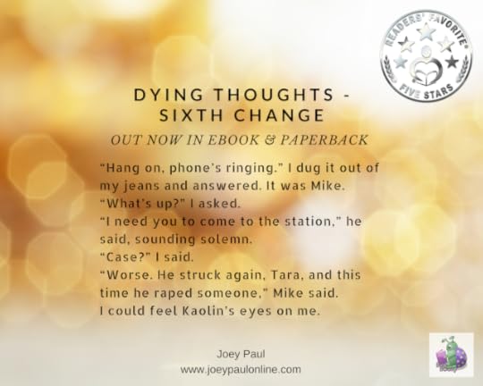 [ID: A blurred photo of firelights with the title DYING THOUGHTS - SIXTH CHANGE at the top and out now in ebook & paperback just below the title The except reads: