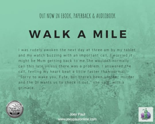 [ID: A dirty green background with the title WALK A MILE at the top and out now in ebook, paperback & audiobook just below the title The except reads: