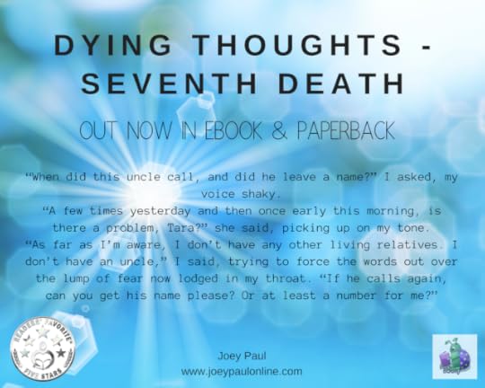 [ID: A blue background with the title DYING THOUGHTS - SEVENTH DEATH at the top and out now in ebook & paperback just below the title The except reads: