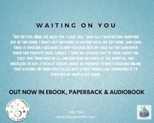 [ID: A turquoise background, with the title WAITING ON YOU at the top and out now in ebook, paperback & audiobook just below the excerpt The except reads: