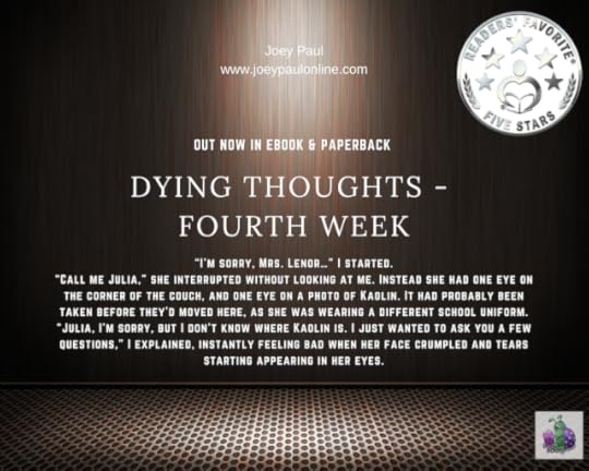 [ID: A dark room with the title DYING THOUGHTS - FOURTH WEEK at the top and out now in ebook & paperback just above the title The except reads: