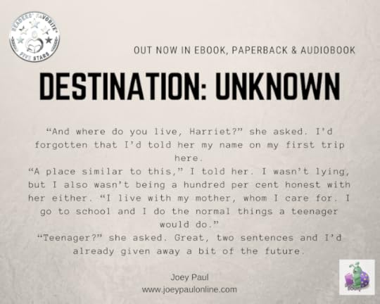 [ID: A light grey with the title DESTINATION: UNKNOWN at the top and out now in ebook, paperback & audiobook just above the title The except reads: