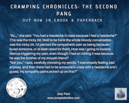 [ID: A dark blue background with the title CRAMPING CHRONICLES: THE SECOND PANG at the top and out now in ebook & paperback just below the title The except reads: