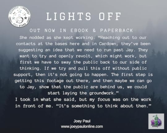 [ID: A shadowed forest background with the title LIGHTS OFF at the top and out now in ebook & paperback just below the title The except reads: