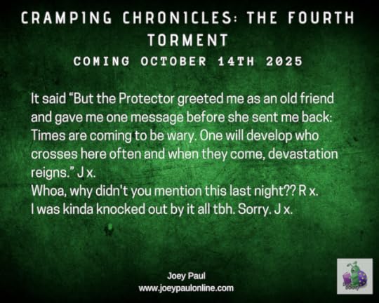 [ID: A dark green background with the title CRAMPING CHRONICLES: THE FOURTH TORMENT at the top and coming October 14th 2025 just below the title The except reads: