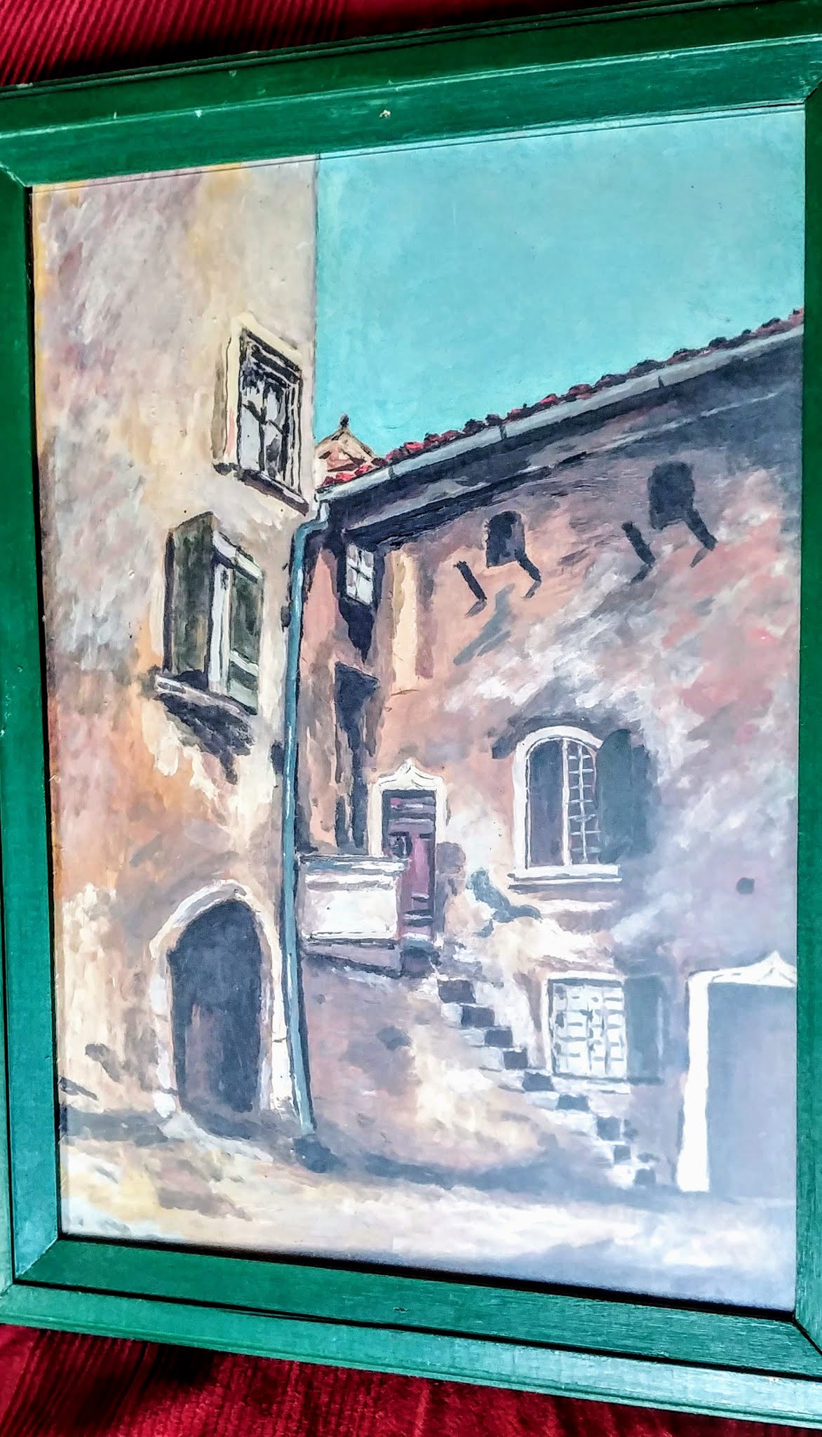 One Saturday afternoon, about 20 years ago, my husband and I took a carload of junk to the tip. While we were disposing of everything, an object caught my eye, just sitting there, undamaged, amidst all the rubbish. It was this painting, depicting the courtyard of an old French stone house.