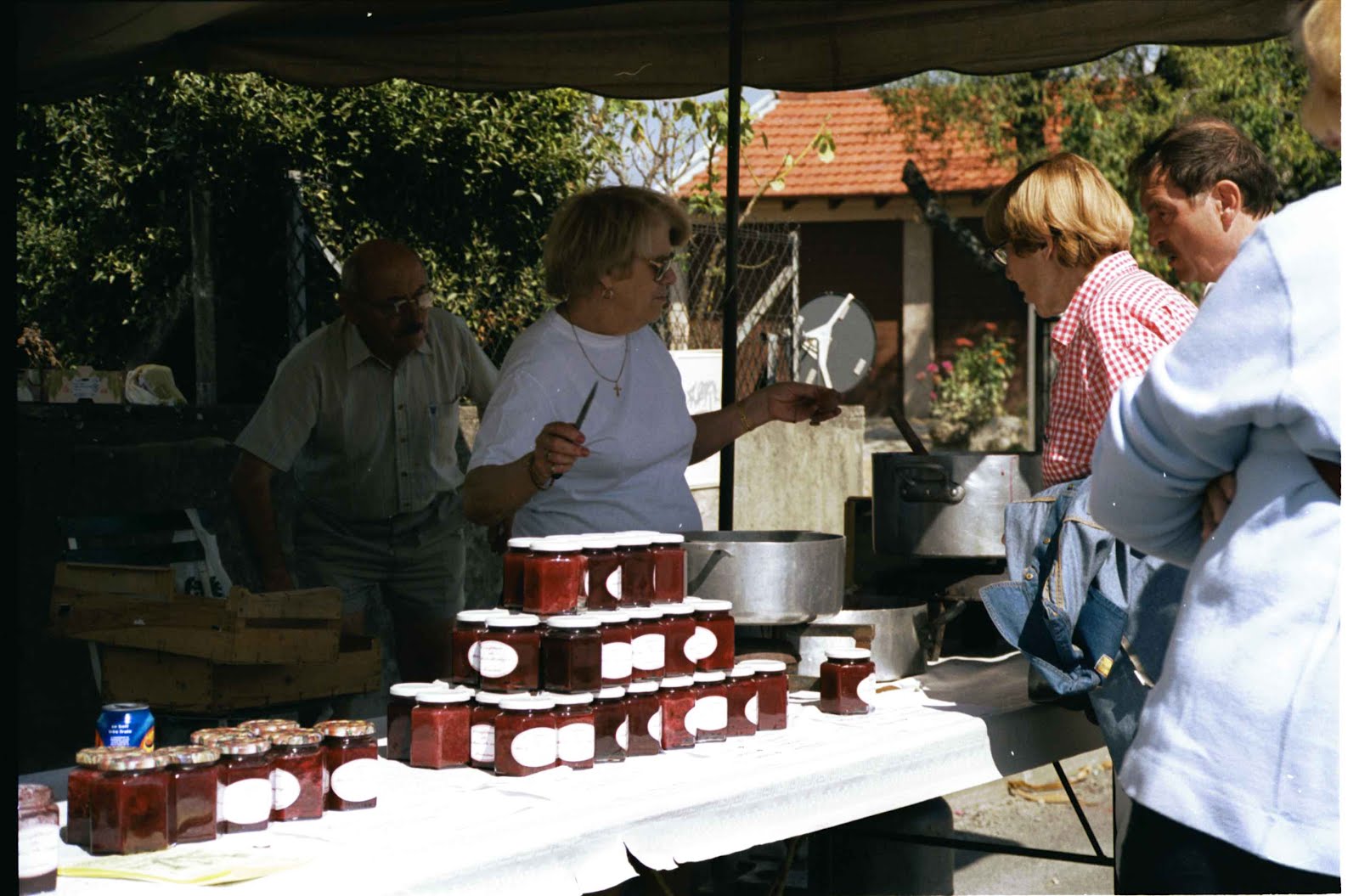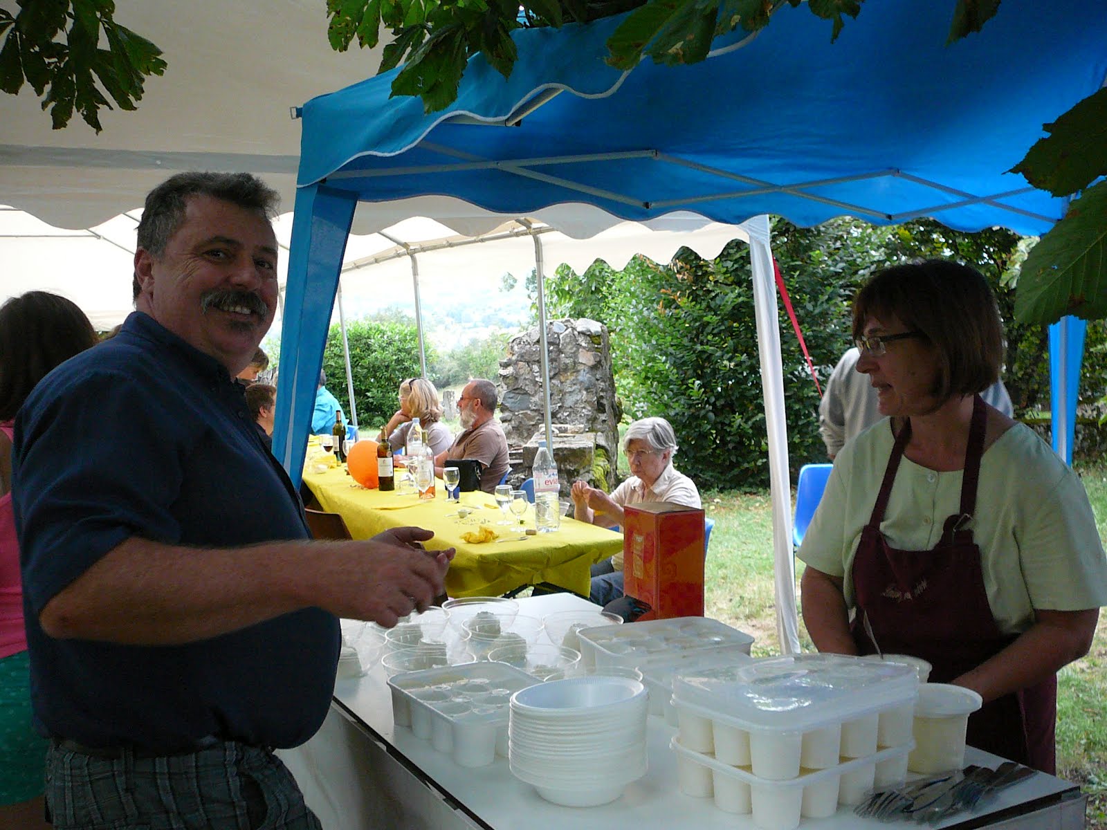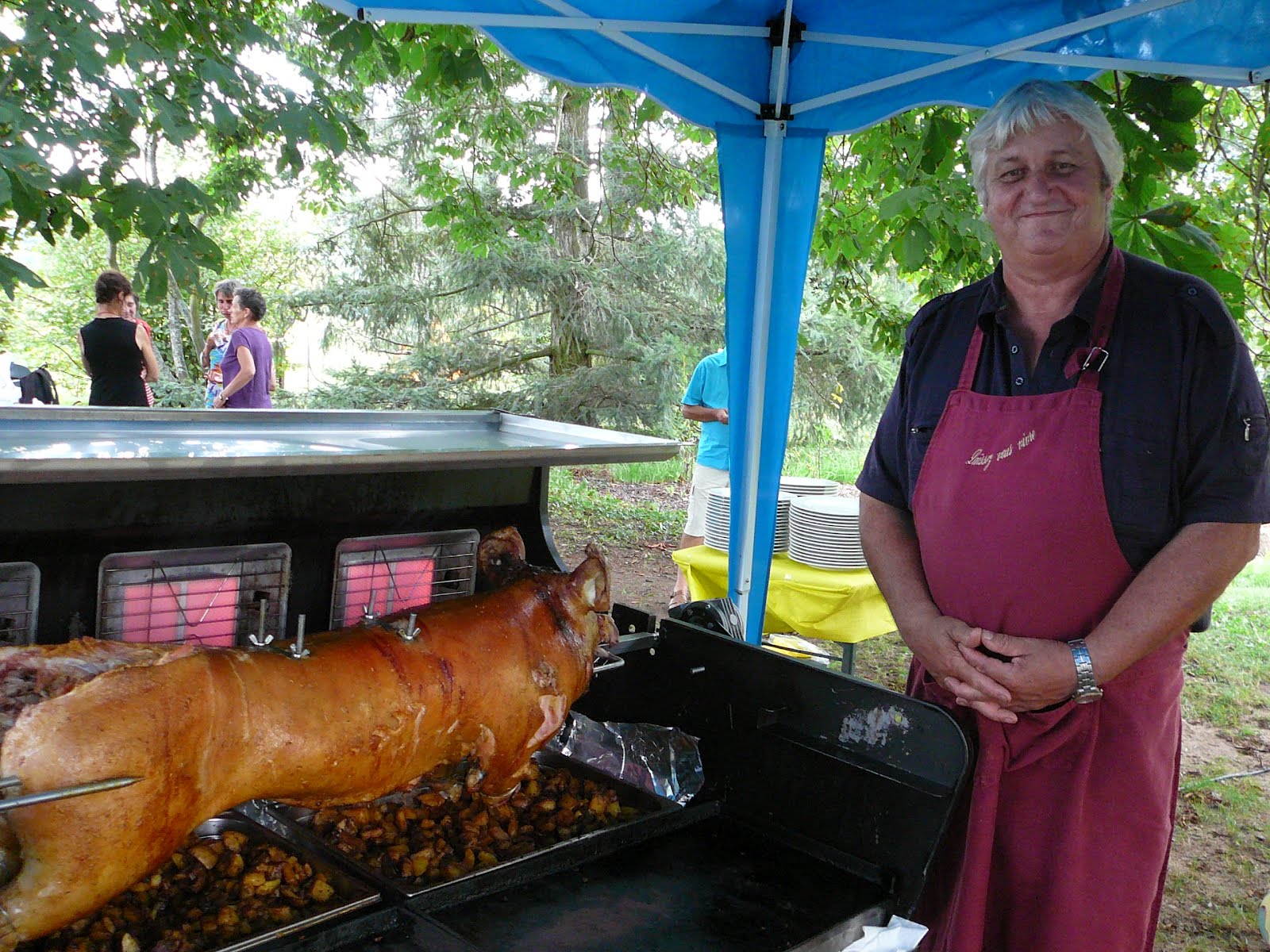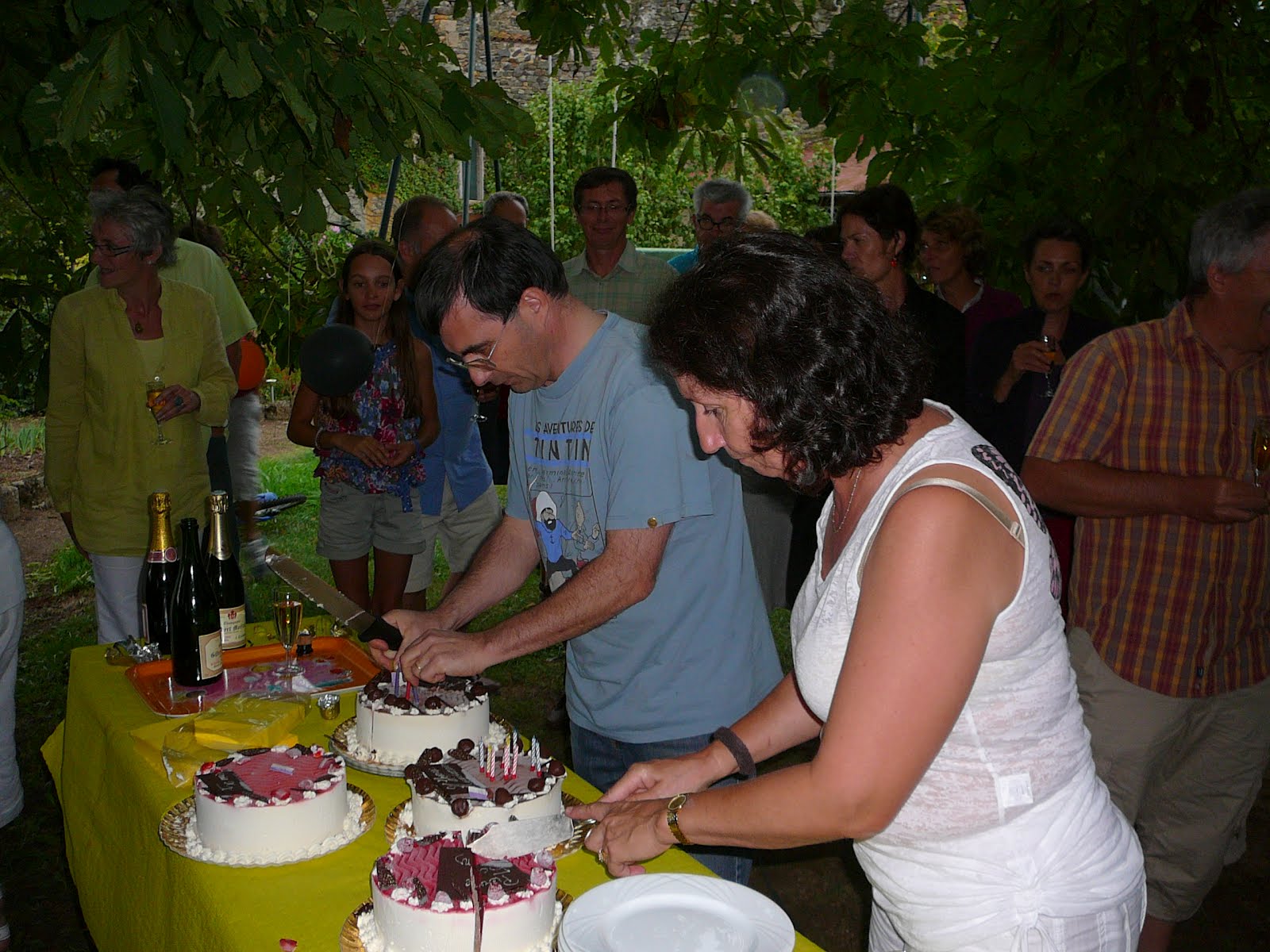 Salads of different varieties were served, then potatoes sautéed in the pig fat (forget that diet!), tasty ratatouille and tender slices of roasted pig. Fromage blanc with generous dollops of double-cream followed, the meal culminating in candles, song and cake: chocolate or raspberry topped ice-cream gateau.