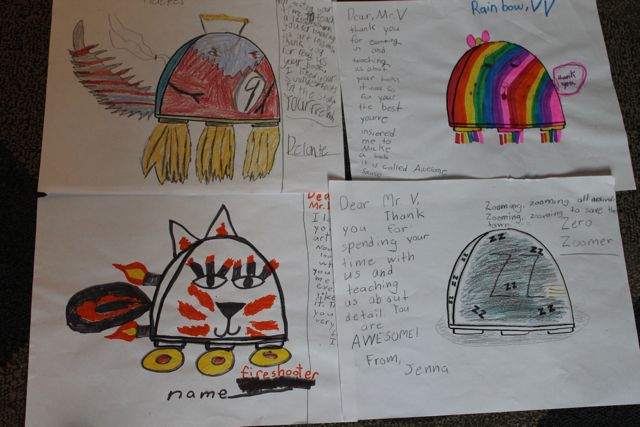 "Dear Mr. V, Thank you for taking your time and energy to come to my school. You really inspired me to become an author-strator. Also, for teaching me new art skills. And telling me that children's book ideas are everywhere. Also, I will find my author-strator glasses and write a story!"