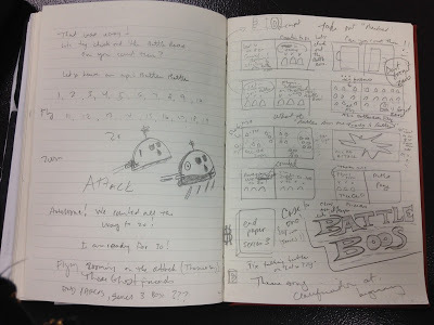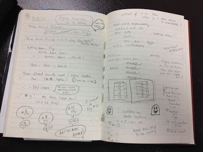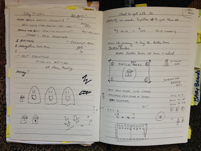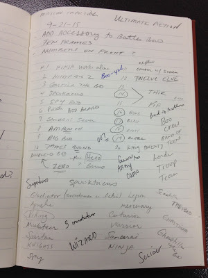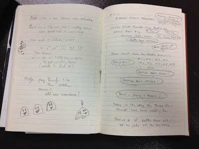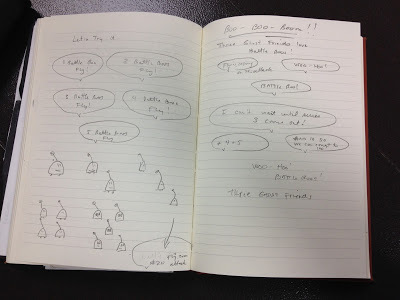 I initially answered the questions with a few ideas -- "Boo-bots, Battle Boos!, Boo-ba-loos." Also, I wrote "Collect all 20. 30." There were even ideas of boo bucks being used to buy the toys and the toys came in multiple series. All of these ideas would find their way, three years later, into THREE GHOST FRIENDS AND THE BATTLE BOOS! (Except for the Boo-ba-loos. I don't know what that idea was all about.)