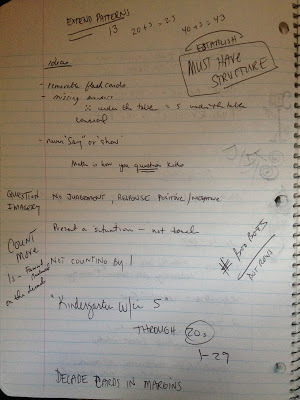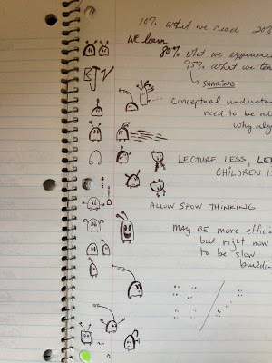 This idea sat in my journal for over a year. It was during the Halloween season of 2013 that I returned to the idea when I took a graduate class about teaching common core math concepts to early elementary students. I wondered if I could incorporate the concepts I was learning in the class into the story; dot patterns, ten frames, and other visual math stuff. During each class I doodled and wrote down ideas in the margins of my notebook.