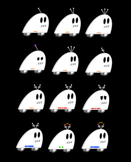 Later in my doodles, the Boo-Bots lost their wheels and appeared with rocket boosters. I thought, if the Boo-bots could fly then I could visually show the Boo-Bots flying in dot patterns.