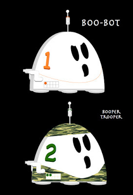 I started working on the idea at the beginning of September to get my ideas organized so I would be ready to start illustrating in October. However, I was surprised when ideas started pouring out once I look at the toys as Battle Boos instead of Boo-Bots.