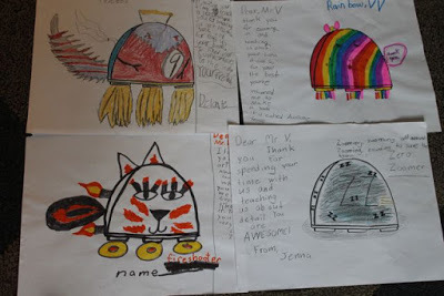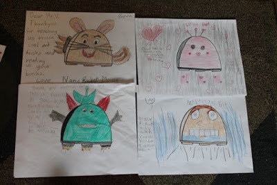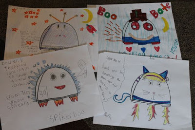 The flames coming out of Spidekes are intense! The note from the student who created Rainbow VV states, "You've inspired me to make a book. It is called Awesome Sauce." Well, I think Rainbow VV is "awesome sauce" and I can't wait to read your story! Zero Zoomer has its own theme song -- "Zooming, Zooming all around. Zooming Zooming to the save the town!" It looks like Fireshooter shoots flames out of its eyes! Whoa!There were so many more Battle Boos too! I loved each and every one. Thank you so much!