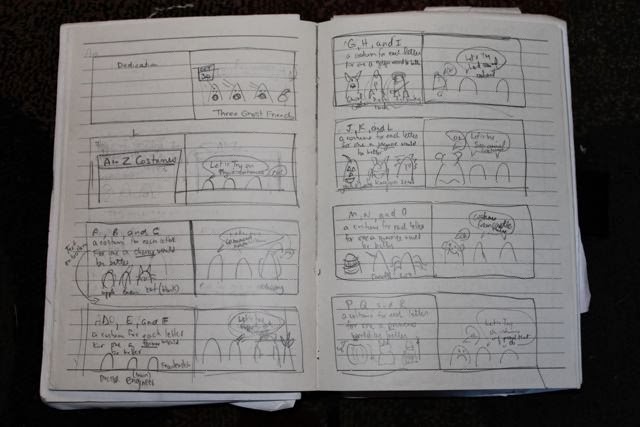 Next, I had to figure out how to organize the book. I remember this coming pretty easily because much of the organization was done with the order of the costumes. Also, the storyline had been rolling around in my head for quite some time. I sketched out the pages and only a few things changed from the sketchbook to the final layout.