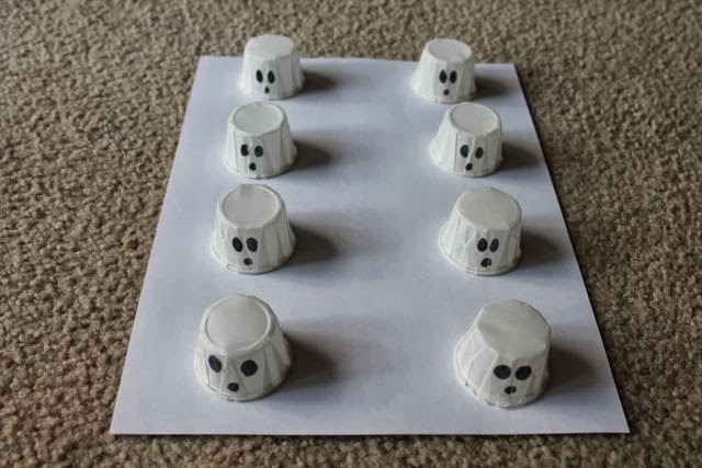 I used a spoon to carve out the eyes on eight of the ghosts. Then, I formed the eye holes with my finger.