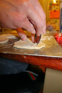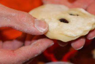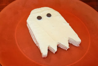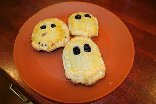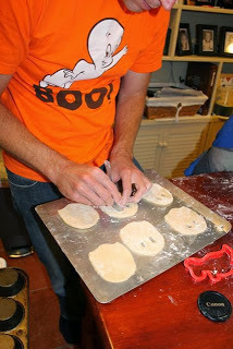 You would think that a guy who writes children's books and blogs about ghosts would have a ghost cookie cutter. But, I don't! I improvised with pumpkin and dinosaur cookie cutters. I found that once you have the basic shape you can form the ghosts with your hands.