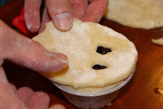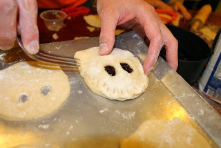 I used a fork to crimp the edges.I forgot to take more pictures after this step. But, once I made all the ghost mini-pies I placed them in the freezer for 30 minutes. After 30 minutes, I removed them from the freezer and brushed them with the beaten egg and 1 Tbs. water. I baked them in a 400 degree oven for 15-20 minutes.