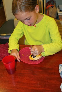 On the stove over medium heat, cook your black raspberries along with 1/2 cup sugar, 1 1/2 Tbs. corn starch, and a pinch of salt for about 10-15 minutes. Let your berry filling cool because you will be working with it and I don't want you to get burned. (I am sure you could use blueberries or strawberries instead of black raspberries. It is just what we had in the freezer!)