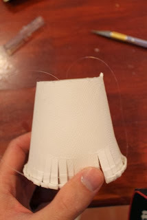 Then I taped the ends of a piece of fishing line to opposites sides of the inside of the cup. I did this so I could hang my light bulb ghost. You wouldn't need to do this if you just wanted your light bulb ghosts to sit on a table or a mantle.