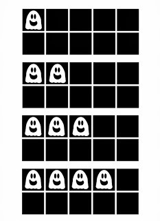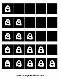 Five frames in black and white are included in the packet. Quickly show and hide the five frame to your child. Ask "How many ghosts did you see?"and "How many empty squares?" and "How many more do you need to make five?" Don't be afraid to mix up your questioning throughout the exercise.
