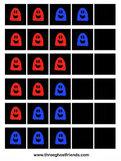"Parts of five" (five frames with totals of 1-4) are also included in the packet. "How many red ghosts?" and "How many blue ghosts" and "How many all together?"
