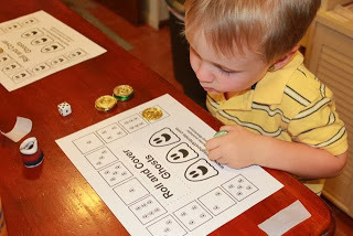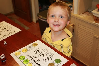 The game my wife suggested was Roll and Cover. The game is simple. Roll a die. Recognize the number of dots and cover the matching spot on the game board. The object of the game is to cover your whole game board.