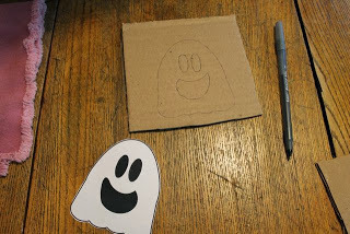 First, draw a ghost on a piece of corrugated cardboard. I traced one of the Three Ghost Friends. It may not matter with your t-shirt design, but I had to keep in mind that I needed my image to be traced backward (mirror image) on the cardboard so that it was the right way once it was stamped on the t-shirt.