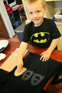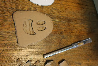 Next, I used an x-acto knife to remove a layer of the cardboard from where I didn't want white paint to show up on my t-shirt. In this case I wanted the eyes and the mouth to be black, not white.