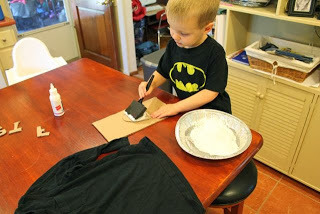 We purchased white screen print ink and my son brushed it on the cardboard ghost stamp.