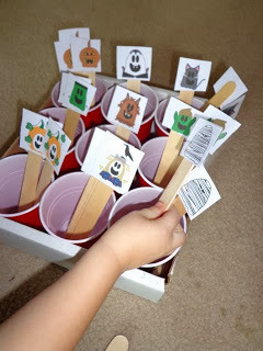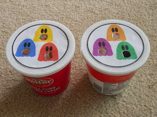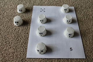 Included in the packet are three printable sheets of dot patterns. (One of the sheets is pictured above.) A child can open the lid, close it quickly, and then state how many ghosts they saw. A teacher or parent could also work with a child and open and close the lid quickly and ask, "How many ghosts did you see?"If a child has advanced in their number sense, they could open two lids and add the numbers mentally in their head. A teacher or parent could guide their thinking by saying, "How many ghosts do you see here? How many there? How many all together?"