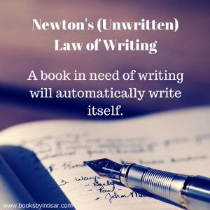 On a regular basis, I find myself astonished at the realization that the books in my head are not going to jump wholly-formed and fully edited into my computer without me. It’s as if I internalized Newton’s (unwritten) Law of Writing that quite reasonably asserts that a book in need of writing will automatically write itself. I mean, what’s with all the stress, and anxiety, and laboring over ideas, and writing and rewriting and rewriting again, and thinking? How about: I’ve got an idea, hey look, now it’s a book!