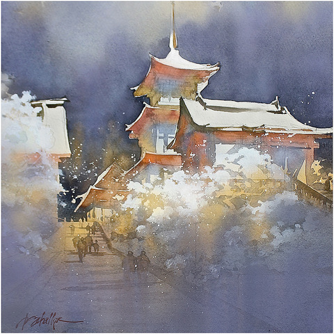 Thomas Shaller’s watercolor technique is highly influenced by his architectural background. You can see this in not only the many classical architectural elements he paints, but also by the technical control he has over the medium itself.