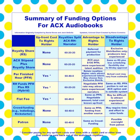 The chart below summarizes funding options for audiobooks created on ACX. Other companies do not offer royalty share option.