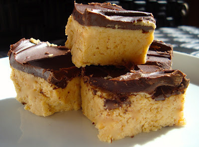 Melt chocolate pieces in top of double boiler. Meanwhile mix together peanut butter, cracker crumbs, butter and icing sugar. Pat this into a 13 x 9-inch pan. (See note.) Spread the melted chocolate on top. Chill and cut into small squares. Freezes very well.