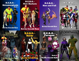 -H.E.R.O. - Gene Front is my current book, and ought to be released in about a month (roughly, e.g. around mid or late July 2012). This will be the 7th full novel in the H.E.R.O. series, in addition to 2 short stories, and an illustrated guide. (I do 3D character art as well, and use it on my covers, and for bonus pictures on my Facebook page and web site. I did up some neat collage-style artwork for characters in that book for most of the major characters in my series.)