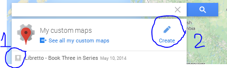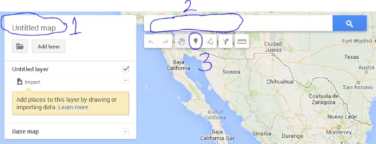 Click on the photo to enlarge.(3) When you click "Create" you should get a screen like the one below. First, name your map by clicking on the "Untitled map", put in a name and click "Save". Second, type in the location where your story takes place. Then, start putting locations on your map by using the upside-down drop symbol (see 3).