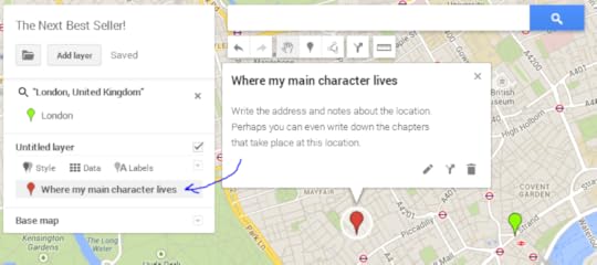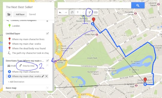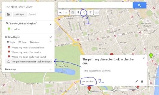 Click on the photo to enlarge.(5) Put as many places on your map as you like. Another cool feature of google maps is the line/path tool (see 1). You can mark the paths your characters take. Name the path and write notes about it. Maps will even tell you how long the path is so you can write that information in your book.