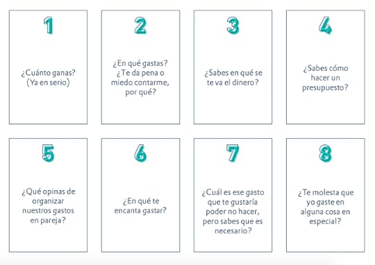 Las imprimes, las recortas y haces un date financiero con tu amorcito. Pueden irse a cenar o preparar una comida romántica en casa y después se ponen a jugar. La idea es contestar todas las preguntas honestamente, ¿hay alguna que te esté costando trabajo? Pones 20 pesos (1 dólar, aproximadamente) por cada respuesta sin contestar.